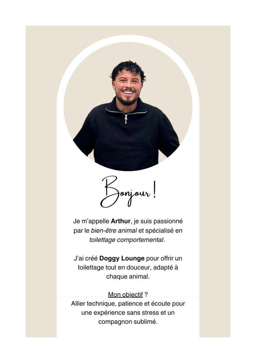 Derrière Doggy Lounge, il y a Arthur, un toiletteur passionné et animé par l’amour des animaux et le souci du détail. Son objectif est simple : offrir à chaque animal une expérience douce, rassurante et de qualité, dans un environnement calme et apaisant et ce grâce au toilettage comportemental.